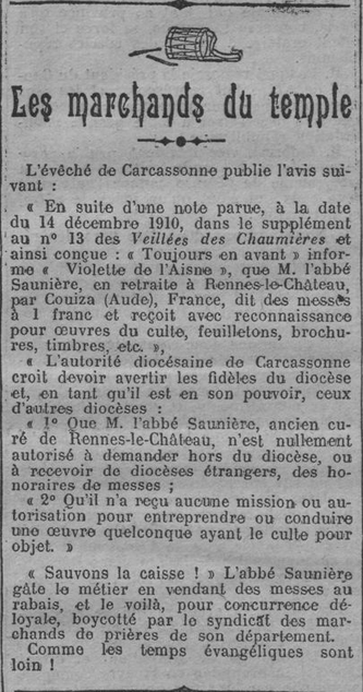 « En suite d’une note parue, à la date du 14 décembre 1910, dans le supplément au n°13 des Veillées des Chaumières et ainsi conçue : « Toujours en avant » informe « Violette de l’Aisne », que M. l’abbé Saunière, en retraite à Rennes-le-Château, par Couiza, France, dit des messes à 1 franc et reçoit avec reconnaissance pour œuvres du culte, feuilletons, brochures, timbres, etc. »